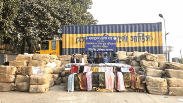 ফতুল্লায় শুল্ক ফাঁকি দিয়ে আসা প্রায় ২০ কোটি ৬৭ লাখ ৫০ হাজার টাকা মূল্যের বিপুল পরিমাণ ভারতীয় শাড়ি জব্দ করেছে বাংলাদেশ কোস্ট গার্ড। এসময় একজনকে আটক করা হয়। শুক্রবার (২৩